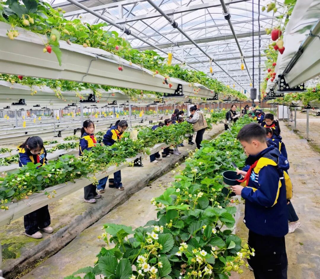在特色種養(yǎng)基地,同學(xué)們實(shí)地探訪“稻蝦共生”“稻鴨共生”生態(tài)循環(huán)模式,深入了解現(xiàn)代生態(tài)農(nóng)業(yè)如何利用生物互作原理實(shí)現(xiàn)綠色高效種養(yǎng),將書(shū)本知識(shí)與前沿農(nóng)業(yè)科技緊密結(jié)合。萌寵互動(dòng)區(qū)內(nèi),大家近距離觀察小動(dòng)物生活習(xí)性,在輕松互動(dòng)中感受生物多樣性的樂(lè)趣。最受期待的“空中草莓”種植園里,無(wú)土栽培、水肥一體化智能灌溉系統(tǒng)令同學(xué)們大開(kāi)眼界——懸空模式精準(zhǔn)控溫控濕、大幅減少病蟲(chóng)害,智能傳感實(shí)現(xiàn)水肥精準(zhǔn)供給,讓草莓品質(zhì)更優(yōu)、產(chǎn)量更高。同學(xué)們還親手挖掘草莓苗、移栽入盆,在實(shí)踐中真切感受現(xiàn)代農(nóng)業(yè)科技的精妙。本次研學(xué)將科技元素貫穿始終,讓同學(xué)們?cè)诔两襟w驗(yàn)中解鎖農(nóng)業(yè)科技奧秘,真正實(shí)現(xiàn)了在游中學(xué)、在學(xué)中樂(lè)。